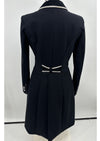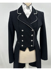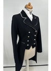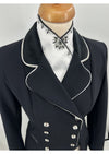 Deze zwarte frack is voorzien van zwart fluweel stof op de kraag, tips en strik en is afgezet met een witte bies.