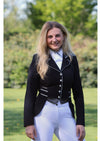 Dit model is de verkorte slipjas, ook wel mini-frack genoemd. Deze zwarte mini-frack is voorzien van een limited edition stof op de kraag, tips en strik en is afgezet met een zilveren shiny bies.