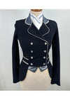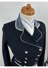 Dit model is de verkorte slipjas, ook wel mini-frack genoemd. Deze donker blauwe mini-frack is voorzien van een limited edition stof op de kraag, tips en strik en is afgezet met een witte bies.