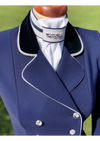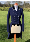 Deze lichtblauwe slipjas is een echte klassieker en is voorzien van een prachtige donkerblauw fluweel op de kraag, tips en strik en is afgezet met een witte bies.
