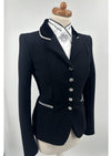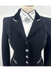 Deze zwarte sportieve wedstrijdjas is voorzien van donker blauw fluweel op de kraag en strik.Verder is deze jas afgezet met een witte bies langs de kraag, strik en zakjes.
