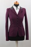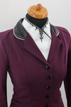 Deze bordeaux jas is voorzien van een prachtige Limited Edition stof op de kraag en strik en is afgezet met een zwarte bies.