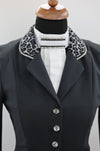 Deze jas is afgewerkt met Swarovski details. Bij deze jas is de Swarovski verwerkt langs de kraag en strik.