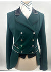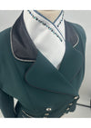 Deze donker groene mini-frack is voorzien van een limited edition stof op de kraag, tips en strik en is afgezet met een shiny zwarte bies.