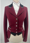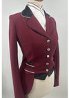 Deze merlot rode mini-frack is voorzien van een limited edition stof op de kraag, tips en strik en is afgezet met een shiny zwarte bies..