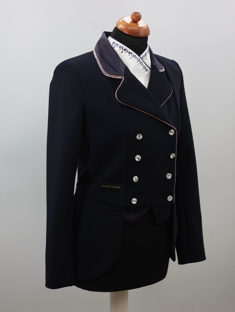 Deze donker blauwe mini-frack is voorzien van Limited sparkle stof op de kraag, tips en strik en is afgezet met een shiny rose bies.