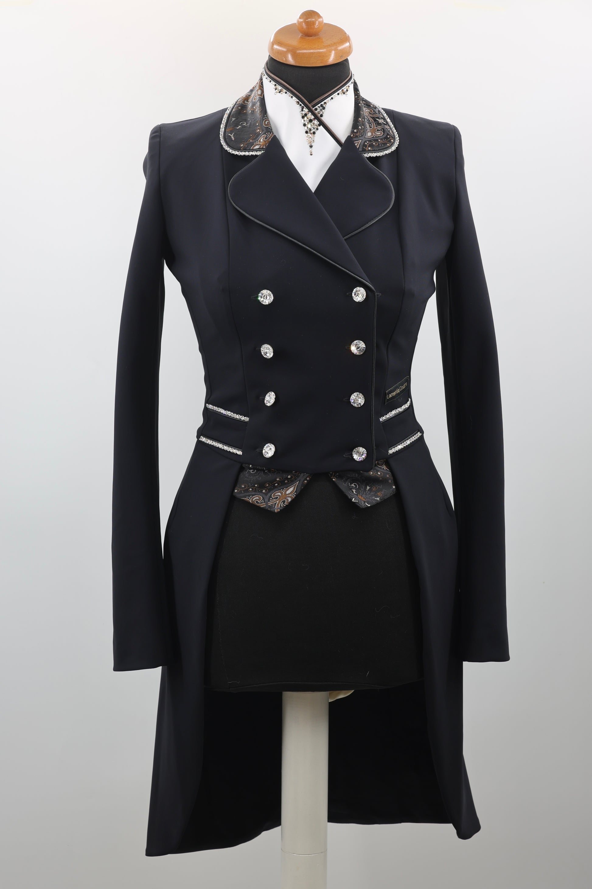 Deze zwarte slipjas is voorzien van een limited edition stof op de kraag, tips en strik en is afgezet met een shiny zwarte bies.