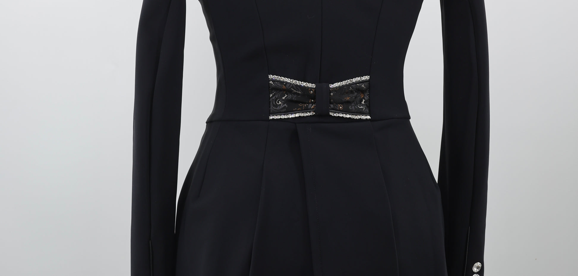 Deze jas is afgewerkt met Swarovski details. Bij deze jas is de Swarovski verwerkt langs de kraag en strik.