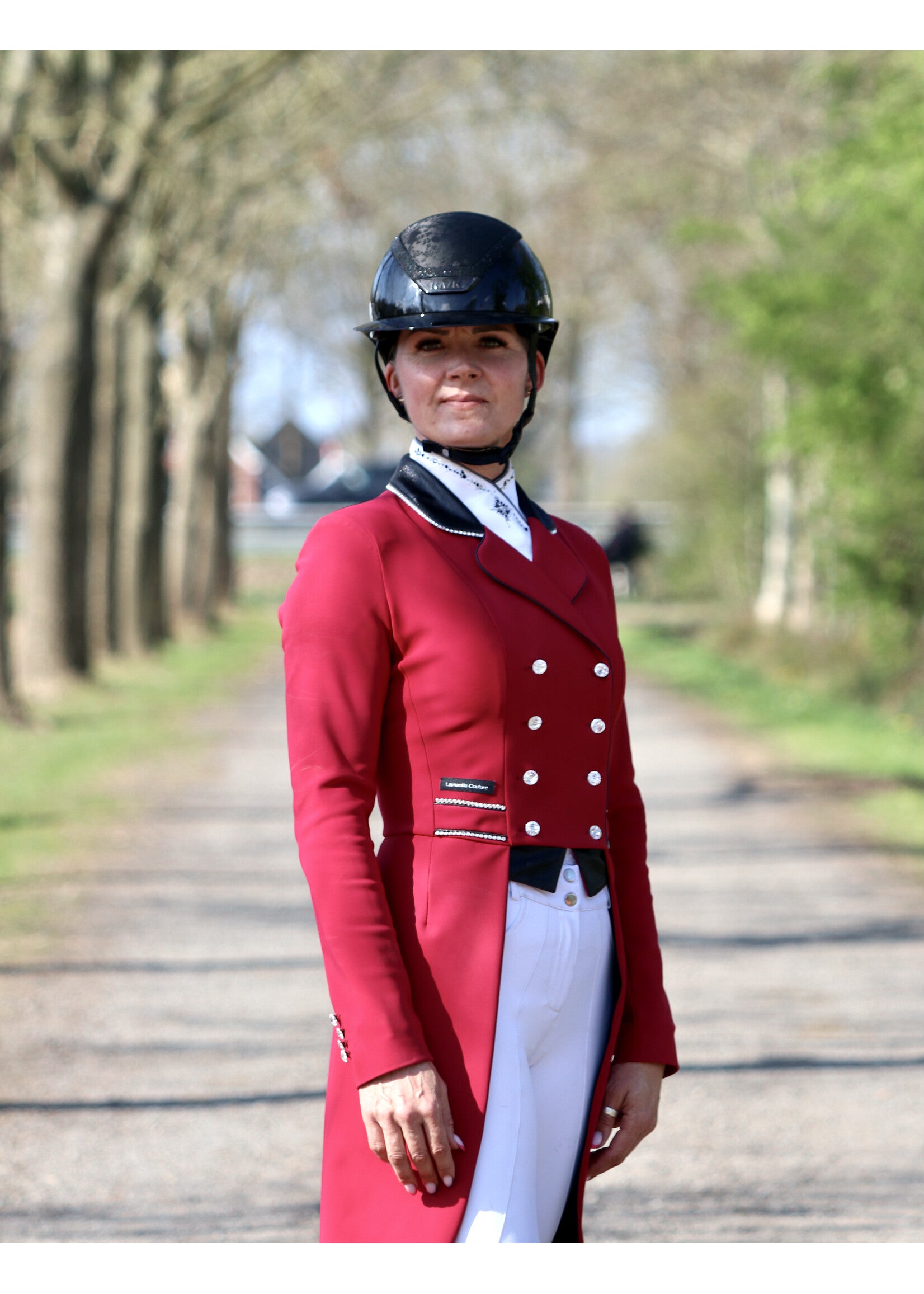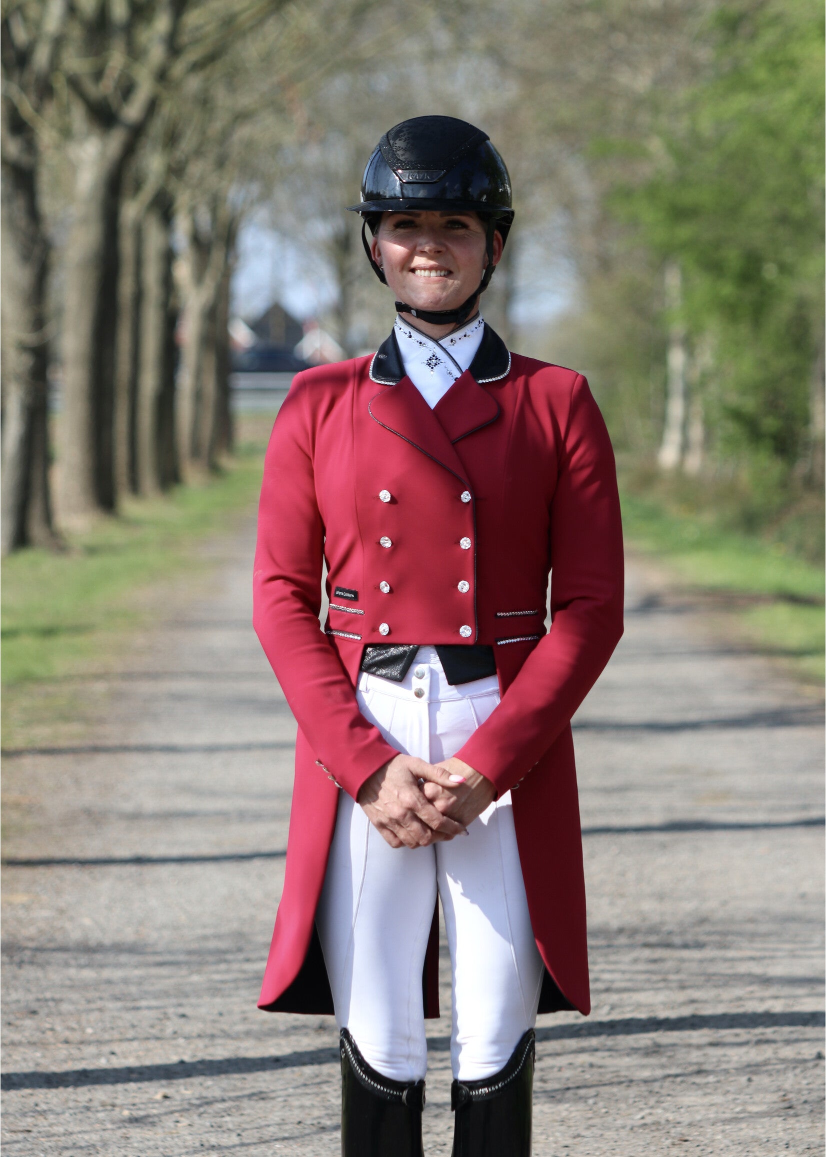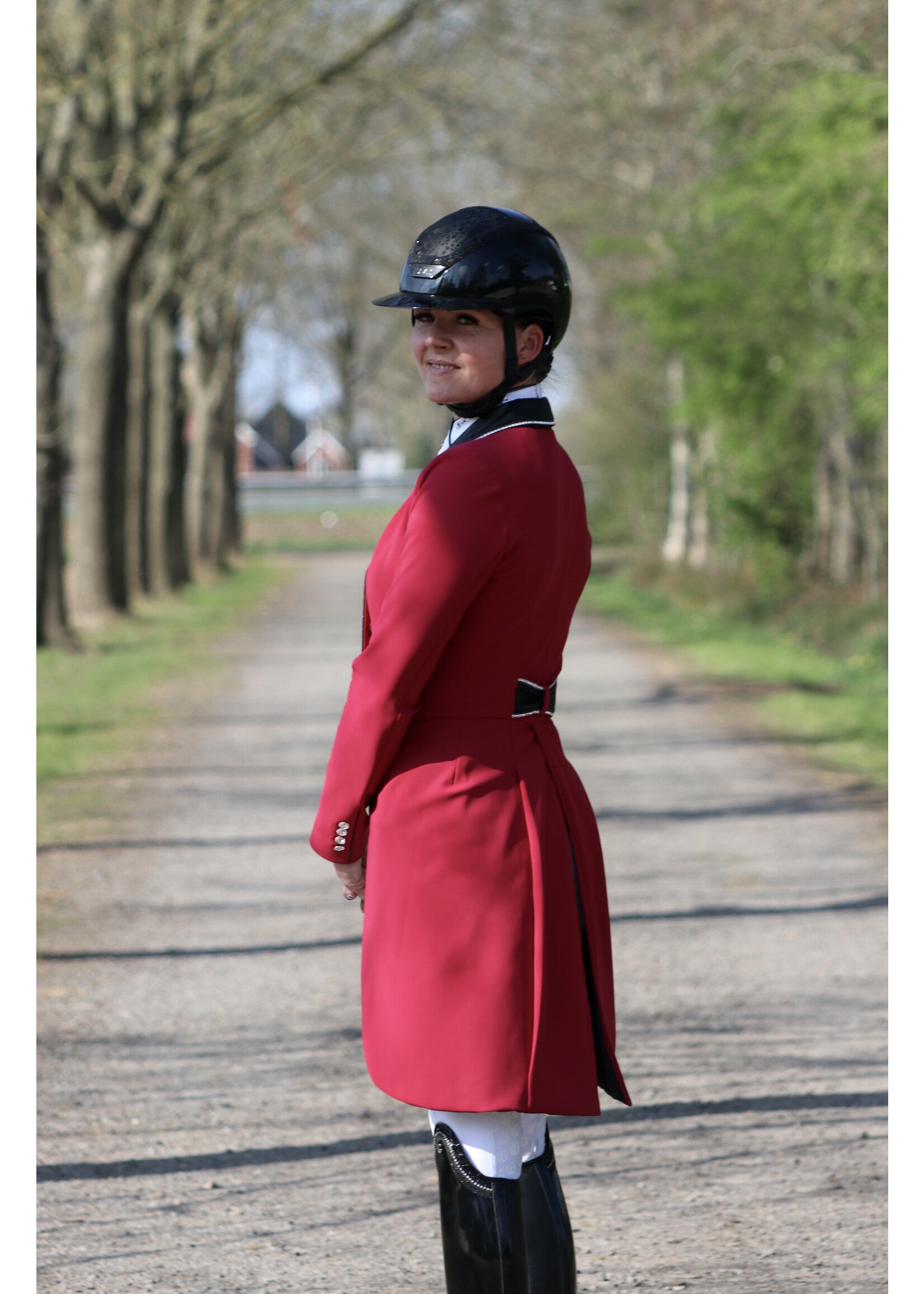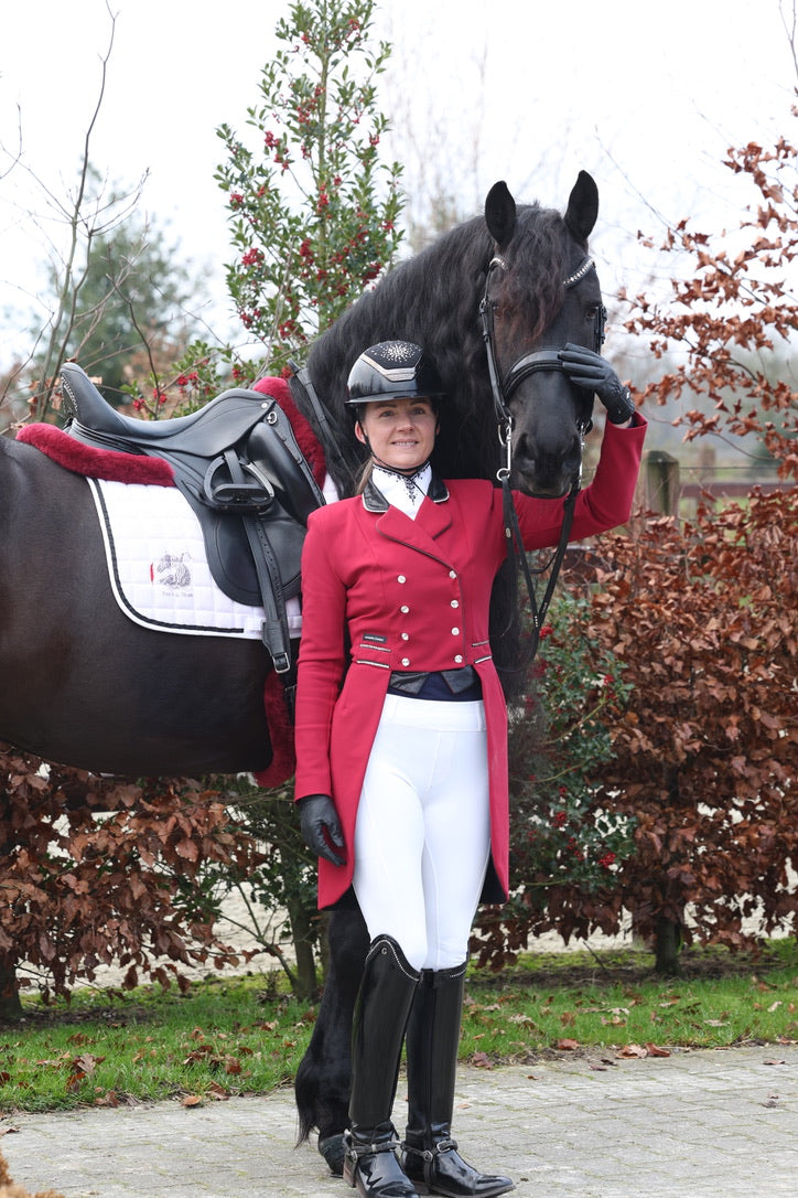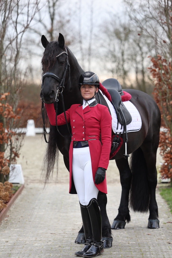 This wine red frack features limited edition fabric on the collar, tips and bow and is finished with a shiny black piping.