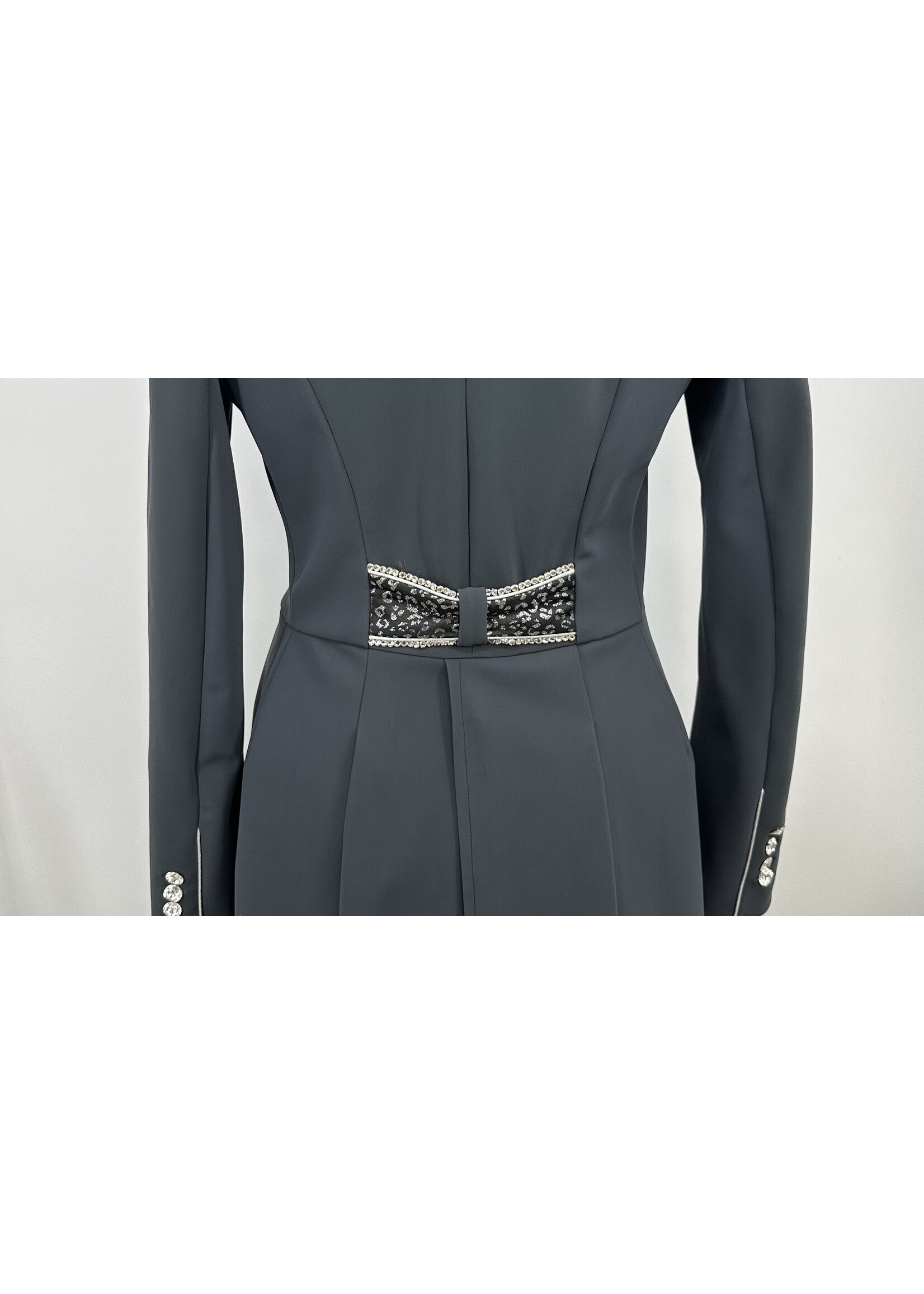 Deze donker grijze slipjas is voorzien van een limited edition stof op de kraag, tips en strik en is afgezet met een shiny zilveren bies.