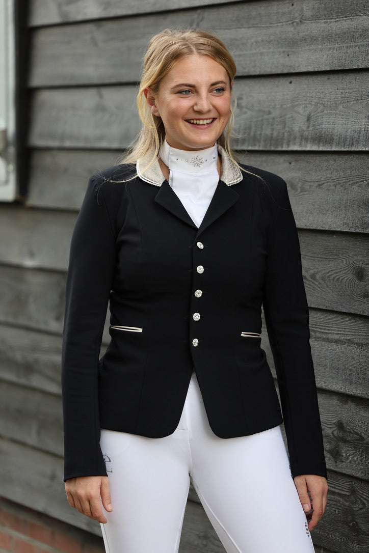 Deze zwarte jas is voorzien van Limited Edition stof op de kraag en strik en is afgezet met een donker blauwe bies langs de kraag en mouwen. Champagne bies bij de zakjes