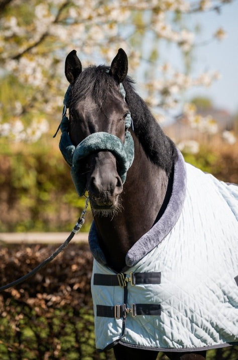 Luxe Velvet deken met teddy bont kraag en kruissingels.