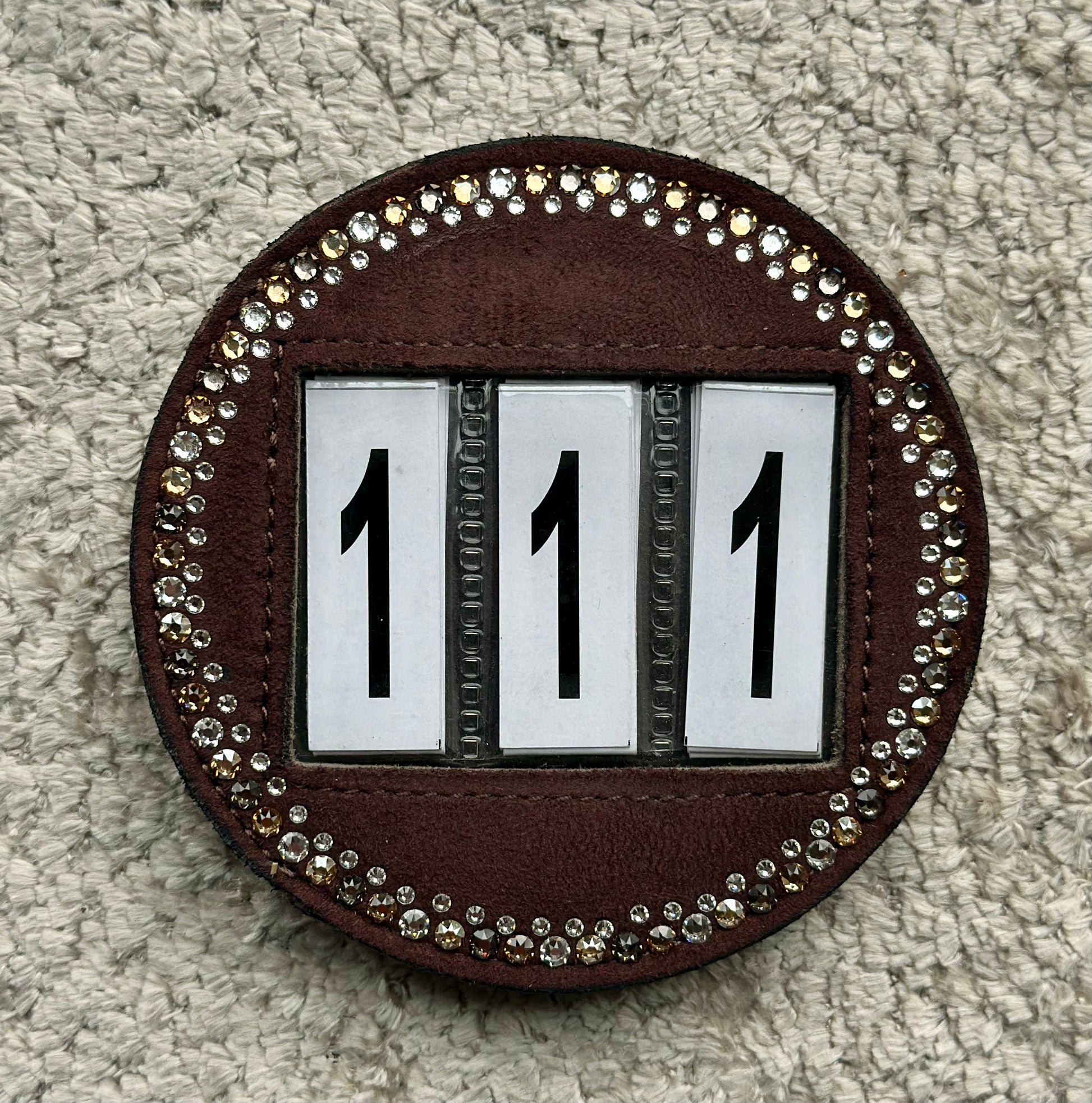 Wedstrijd nummer met Swarovski. Geschikt voor bevestiging aan het hoofdstel, halster en Sjabrak.